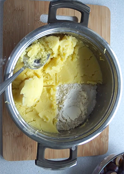 Ułożyć ziemniaki równo w garnku. Wykroić 1/4 ziemniaków. W powstałe miejsce wsypać mąkę pszenną i ziemniaczaną (z lekką przewagą mąki ziemniaczanej).