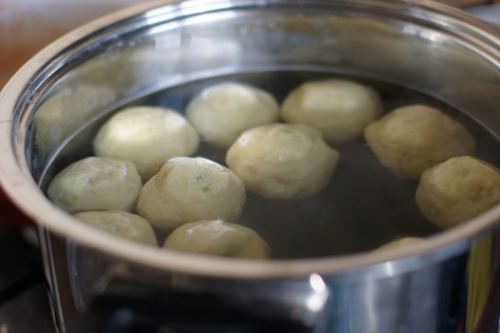 Do wrzątku wrzucać partiami knedle. Gotować aż wypłyną na powierzchnię, a następnie wyłączyć ogień, przykryć i poczekać jeszcze 5 minut.