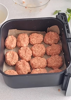 Namoczonymi w wodzie rękami formować nieduże kotleciki (wyszło mi ich 16) i układać ja na półeczce z frytkownicy beztłuszczowej lub blaszce z piekarnika wyłożonej papierem do pieczenia.