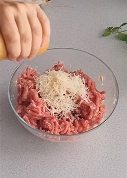 Do bułki dodać mięso mielone, jajka, tarty parmezan i przyprawy. Wszystkie składniki dokładnie wymieszać.