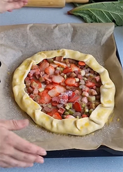 Na ciasto wyłożyć truskawki i rabarbar pozostawiając 4 cm wolnego ciasta na brzegu. Owoce posypać cukrem.